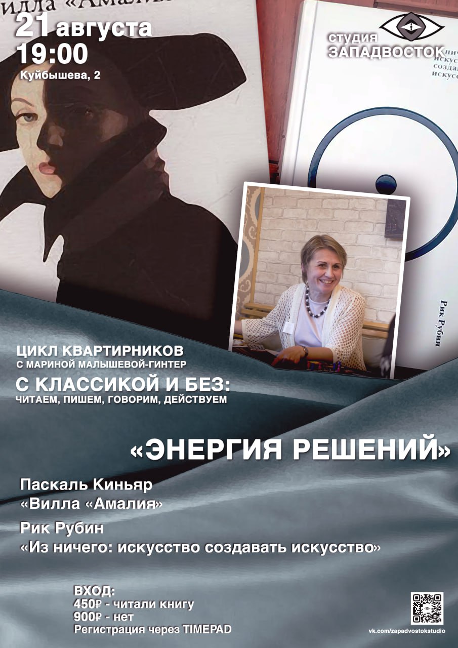 Обсуждаем тему «Энергия решений» на основе книг «Вилла «Амалия» современного французского писателя Паскаля Киньяра и музыкального продюсера Рика Рубина «Из ничего: искусство создавать искусство».